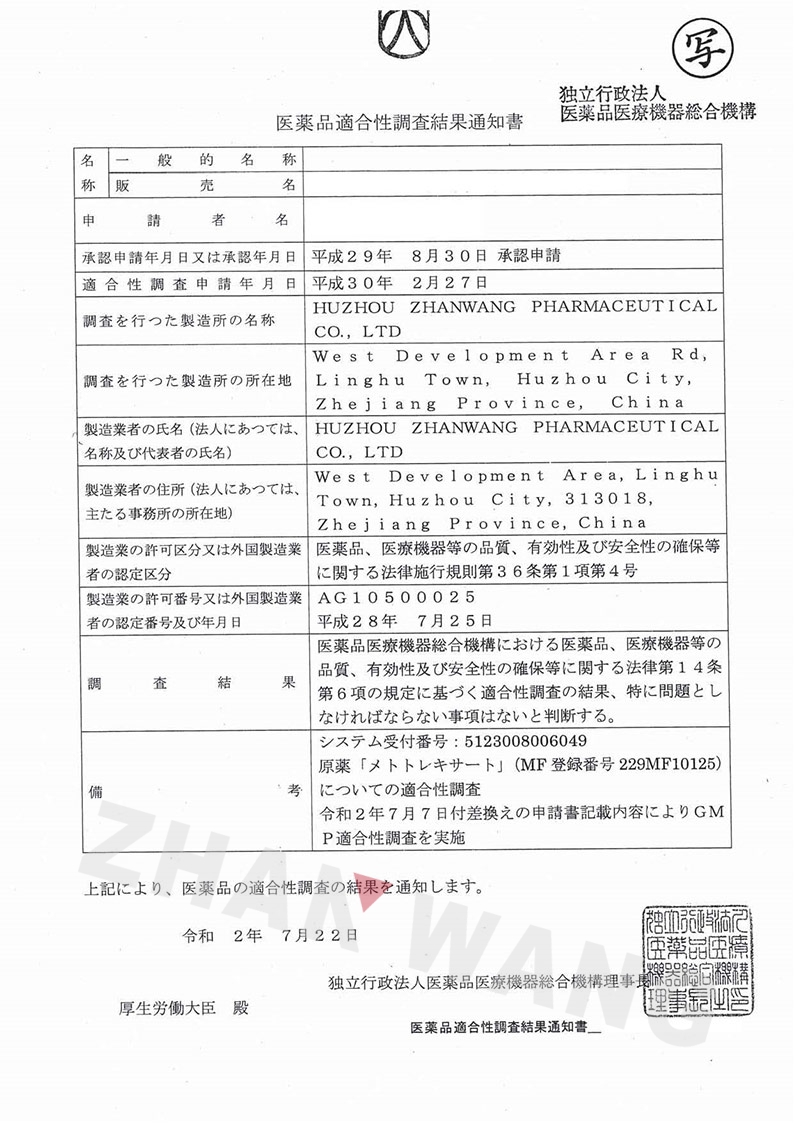 2020年8月17日,湖州展望藥業(yè)有限公司收到日本“獨(dú)立行政法人醫(yī)薬品醫(yī)療機(jī)器総合機(jī)構(gòu)(PMDA)”簽發(fā)的醫(yī)藥品適合性調(diào)查結(jié)果通知書(shū),確認(rèn)公司產(chǎn)品甲氨蝶呤通過(guò)日本PMDA認(rèn)證,符合GMP(藥品生產(chǎn)質(zhì)量管理規(guī)范)。