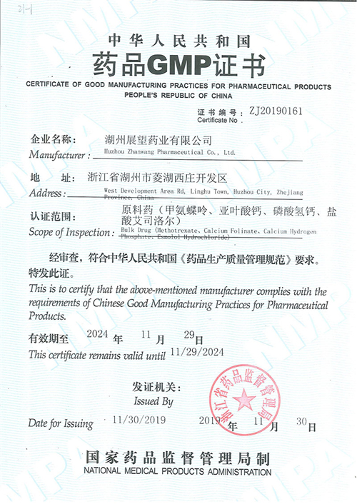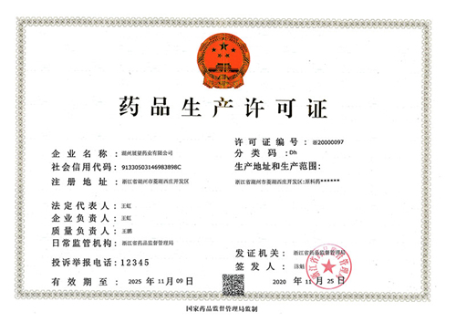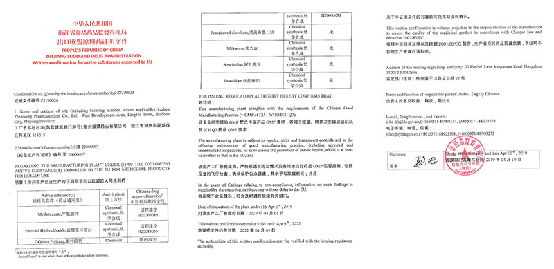 展望藥業(yè)7種原料藥獲中華人民共和國浙江省食品藥品監(jiān)督管理局出口歐盟原料藥證明