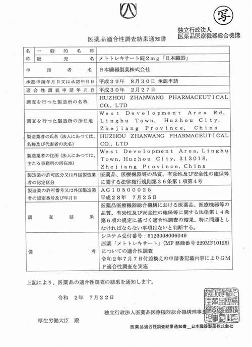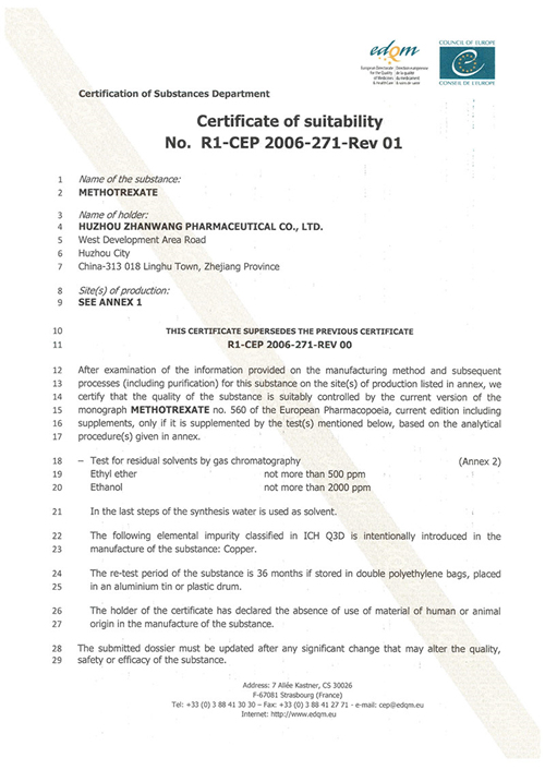 甲氨蝶呤 2021 CEP認(rèn)證(歐洲藥典適應(yīng)性證書)