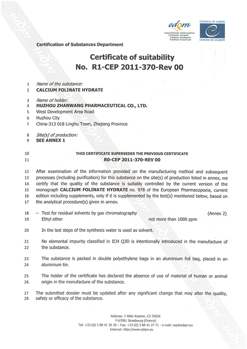 亞葉酸鈣 2019 CEP認(rèn)證(歐洲藥典適應(yīng)性證書)
