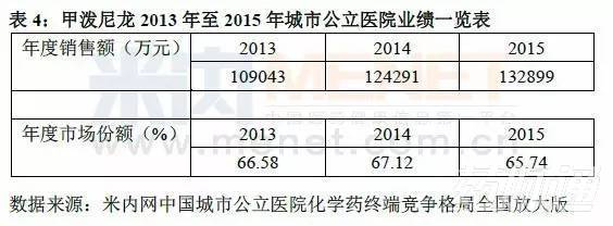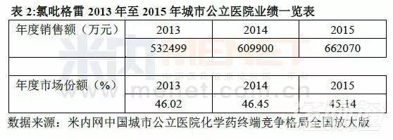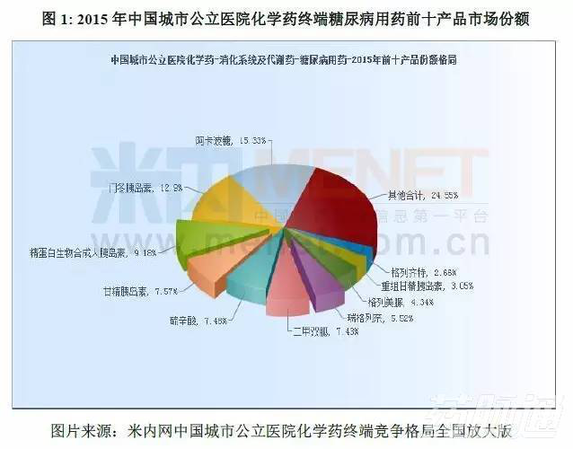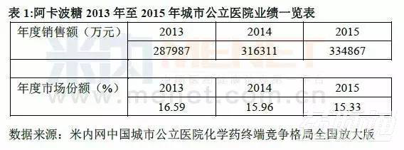 從圖1可以看出,阿卡波糖在2015年中國城市公立醫(yī)院化學藥糖尿病用藥的市場份額是15.33%。結(jié)合表1可知阿卡波糖在城市公立醫(yī)院中的年度銷售額逐年增長,2015年的銷售額達到334867萬元。借助進入2012版基藥目錄的契機,阿卡波糖將實現(xiàn)放量增長,仍有較大的成長空間。