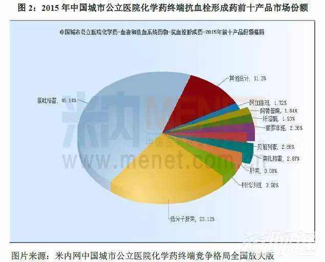抗血栓藥物根據(jù)作用機制可以分為抗血小板藥物,抗凝血藥物和溶栓藥物,抗血小板藥物所占市場份額最大??寡“逅幬镙^多,國內(nèi)主要以氯吡格雷為主。氯吡格雷是賽諾菲的獨家品種,目前國內(nèi)生產(chǎn)企業(yè)有賽諾菲(杭州)制藥有限公司、深圳信立泰藥業(yè)和樂普藥業(yè),現(xiàn)已進入基藥目錄,屬于醫(yī)保乙類藥。米內(nèi)網(wǎng)數(shù)據(jù)顯示,2015年賽諾菲以63.31%的份額處于領(lǐng)先地位,深圳信立泰藥業(yè)緊隨其后占據(jù)32.71%的份額,而樂普藥業(yè)則占據(jù)3.98%的份額。雖然生產(chǎn)企業(yè)不多,但仍有多家在申報企業(yè),未來競爭依然激烈。