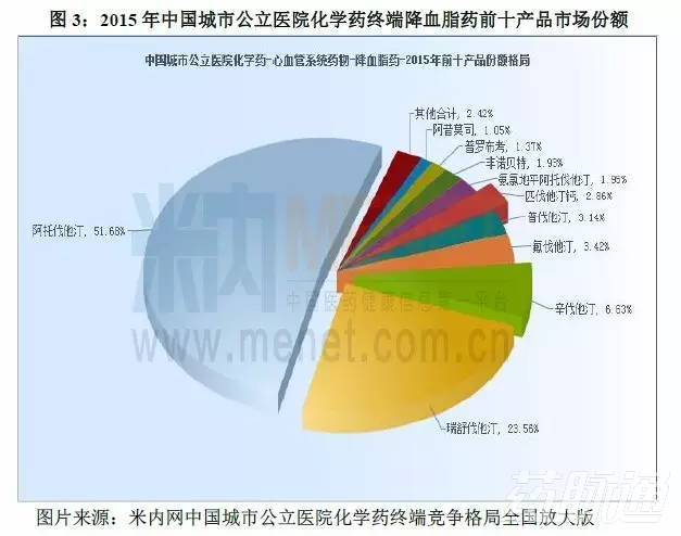由表3可知2015年城市公立醫(yī)院化學藥降血脂藥市場中阿托伐他汀的銷售額呈現(xiàn)增長的趨勢,2015年達到了615044萬元,同比上一年增長了13%。2015年的市場份額為51.68%,較2013年稍有下降但結(jié)合圖3可知阿托伐他汀以絕對優(yōu)勢領(lǐng)先于其他降血脂藥,占據(jù)降血脂藥的半壁江山。