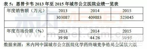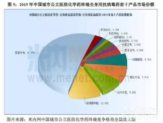 由表5可知恩替卡韋在2013年至2015年城市公立醫(yī)院化學藥全身用抗病毒藥中的年度銷售額和市場份額均呈現(xiàn)增長的趨勢,2015年的銷售額達523045萬元,市場份額占到50.95%,結(jié)合圖5可以看出恩替卡韋在全身用抗病毒藥中的絕對領(lǐng)先地位。
