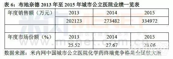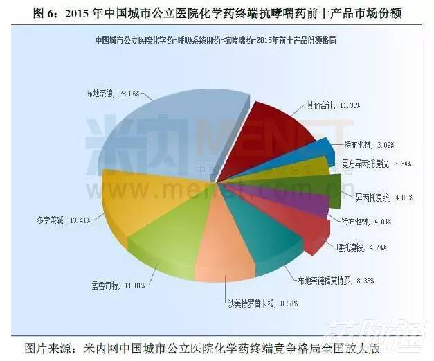 從表6可以清晰地了解到布地奈德2013年至2015年城市公立醫(yī)院化學藥抗哮喘藥中的銷售額和市場份額均在逐年增長,2015年的銷售額為334972萬元,市場份額占比28.06%,結(jié)合圖6可以看出,布地奈德在抗哮喘藥中占據(jù)較大份額。